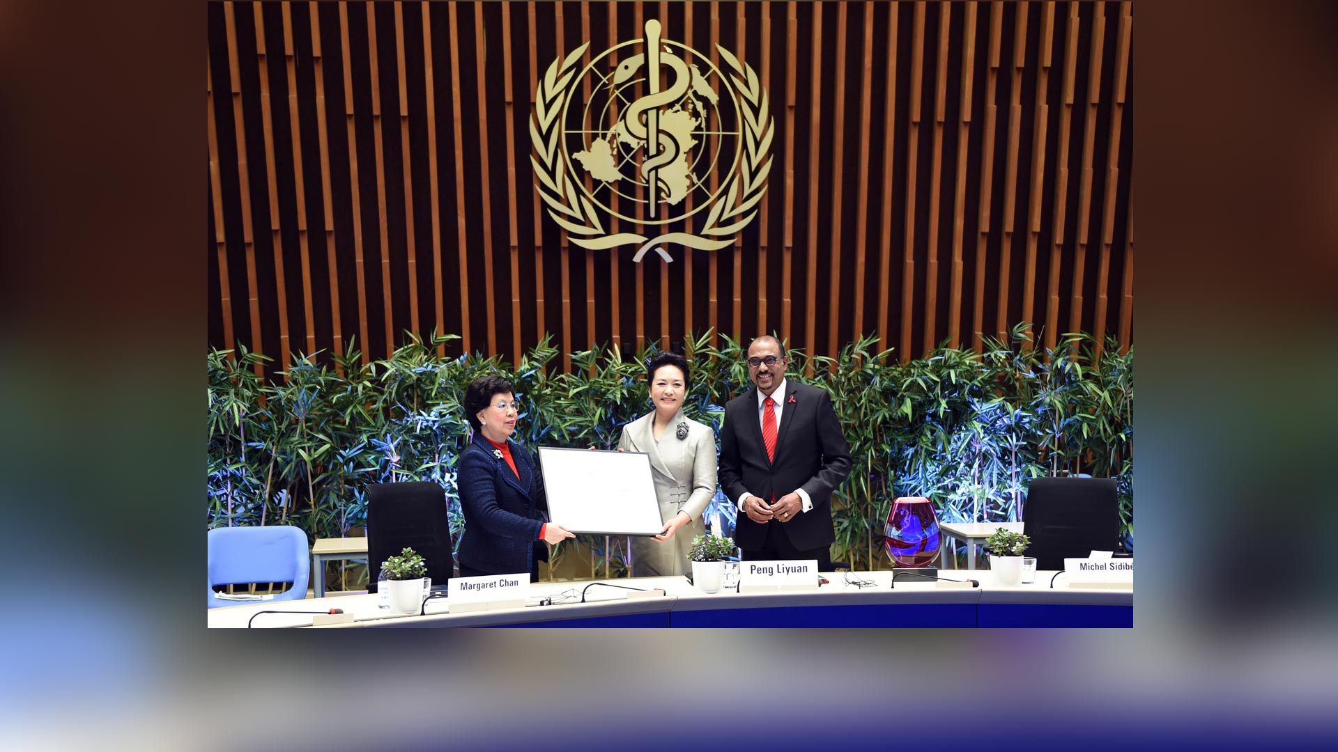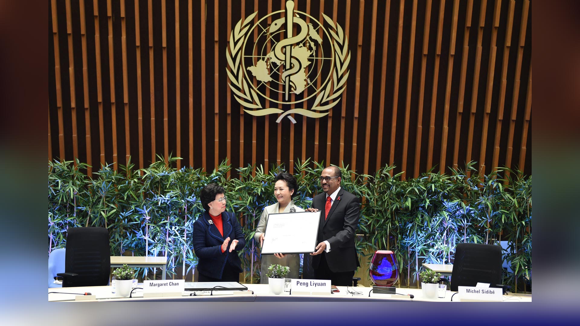 1月18日,國家主席習近平夫人、世界衛(wèi)生組織結(jié)核病和艾滋病防治親善大使彭麗媛應(yīng)世界衛(wèi)生組織總干事陳馮富珍和聯(lián)合國艾滋病規(guī)劃署執(zhí)行主任西迪貝邀請,在瑞士日內(nèi)瓦出席為她舉行的親善大使任期續(xù)延暨頒獎儀式。這是世界衛(wèi)生組織總干事陳馮富珍向彭麗媛頒發(fā)世衛(wèi)組織榮譽勛章。新華社記者謝環(huán)馳攝2017-01-19