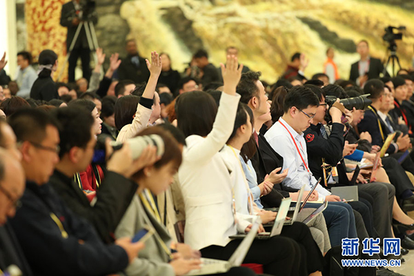 2017年10月17日下午,中國共產(chǎn)黨第十九次全國代表大會(huì)新聞發(fā)言人在人民大會(huì)堂三樓金色大廳舉行新聞發(fā)布會(huì),并回答中外記者提問。圖為記者在現(xiàn)場踴躍提問。新華網(wǎng) 翟子赫 攝