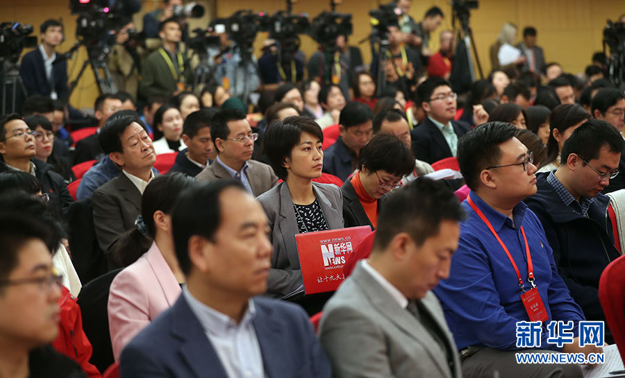 10月22日,十九大新聞中心舉辦記者招待會(huì),邀請(qǐng)教育部黨組書(shū)記、部長(zhǎng)陳寶生,民政部黨組書(shū)記、部長(zhǎng)黃樹(shù)賢,人力資源社會(huì)保障部黨組書(shū)記、部長(zhǎng)尹蔚民,住房城鄉(xiāng)建設(shè)部黨組書(shū)記、部長(zhǎng)王蒙徽,國(guó)家衛(wèi)生計(jì)生委黨組書(shū)記、主任李斌介紹滿足人民新期待,保障改善民生有關(guān)情況,并回答記者提問(wèn)。圖為現(xiàn)場(chǎng)記者。新華網(wǎng) 郝廣鵬攝