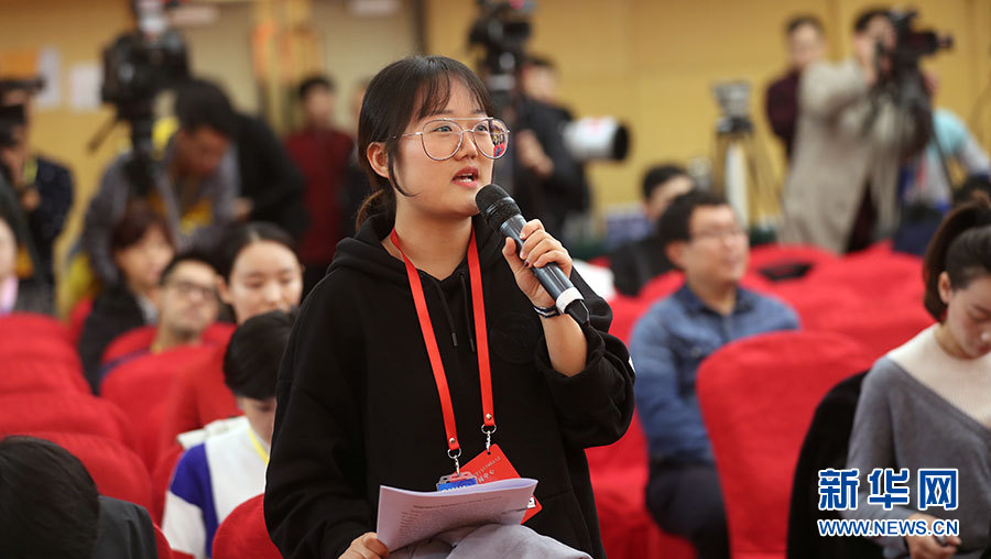 10月22日,十九大新聞中心在梅地亞中心二層新聞發(fā)布廳舉辦集體采訪活動(dòng),邀請(qǐng)教育領(lǐng)域代表談“教育綜合改革”。圖為人民日?qǐng)?bào)記者提問。新華網(wǎng) 郝廣鵬攝