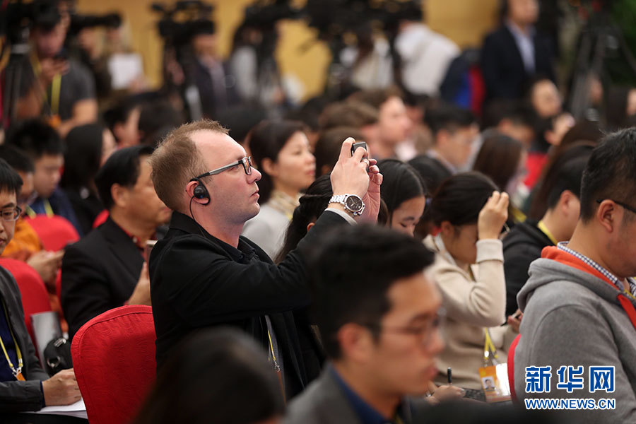 10月23日,十九大新聞中心舉辦記者招待會(huì),邀請(qǐng)中央財(cái)經(jīng)領(lǐng)導(dǎo)小組辦公室副主任楊偉民,環(huán)境保護(hù)部黨組書(shū)記、部長(zhǎng)李干杰介紹踐行綠色發(fā)展理念,建設(shè)美麗中國(guó)有關(guān)情況,并回答記者提問(wèn)。圖為現(xiàn)場(chǎng)記者。新華網(wǎng) 郝廣鵬攝