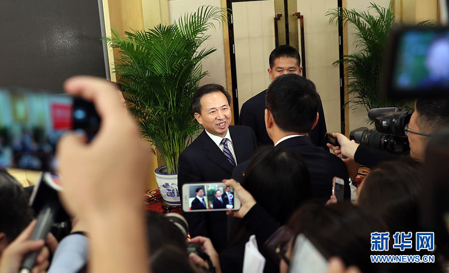 10月23日,十九大新聞中心舉辦記者招待會,邀請中央財經(jīng)領導小組辦公室副主任楊偉民,環(huán)境保護部黨組書記、部長李干杰介紹踐行綠色發(fā)展理念,建設美麗中國有關情況,并回答記者提問。圖為環(huán)境保護部黨組書記、部長李干杰接受記者采訪。新華網(wǎng) 郝廣鵬攝