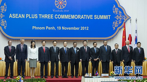 ????新華網(wǎng)金邊11月19日電(記者劉華 馮堅(jiān) 王其冰)東盟與中日韓(10+3)合作15周年紀(jì)念峰會(huì)19日在柬埔寨金邊舉行。中國(guó)國(guó)務(wù)院總理溫家寶與東盟十國(guó)、日本、韓國(guó)領(lǐng)導(dǎo)人共同出席。柬埔寨首相洪森主持會(huì)議。