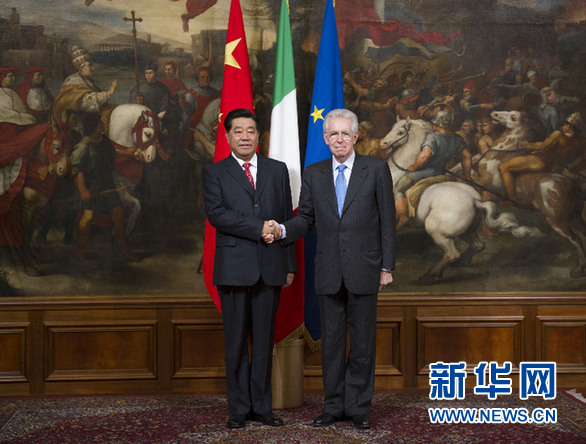 ????當地時間11月28日,全國政協(xié)主席賈慶林在羅馬會見意大利總理蒙蒂。(來源:新華社記者 李學仁 攝)