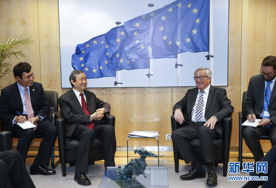 10月18日,在比利時(shí)首都布魯塞爾歐盟委員會(huì)總部,出席第六次中歐經(jīng)貿(mào)高層對(duì)話的國務(wù)院副總理馬凱(左二)會(huì)見歐盟委員會(huì)主席容克(右二)。新華社記者葉平凡攝