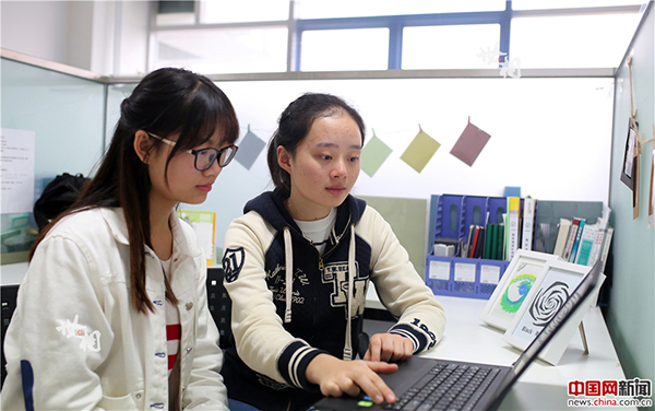陳騫正與付家玉討論下一步產品在校內的推廣宣傳方案。