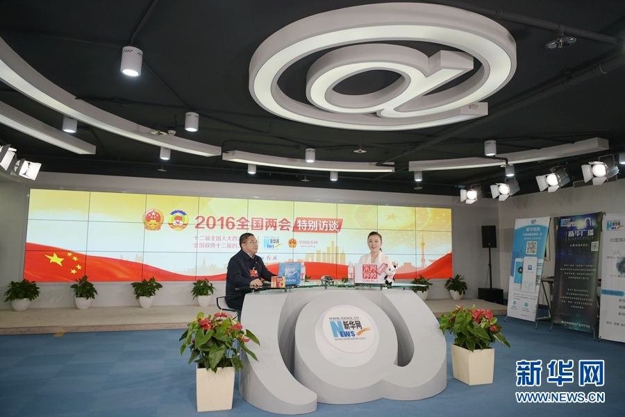 2016年3月12日,全國人大代表、正邦集團董事局主席、總裁林印孫做客新華網(wǎng)兩會訪談直播間。圖為訪談現(xiàn)場。新華網(wǎng) 郭小天 攝