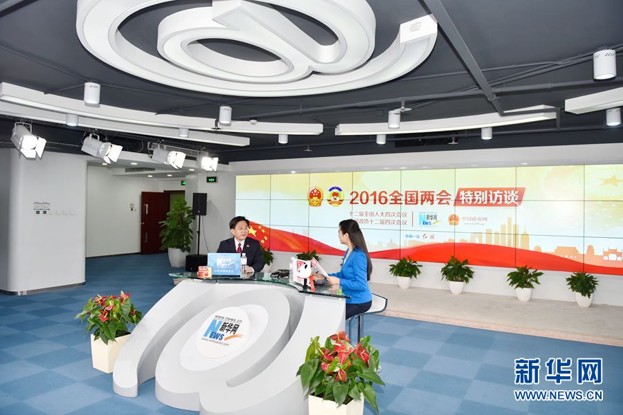 ????2016年3月13日,最高人民檢察院辦公廳主任、新聞辦主任王松苗做客新華網(wǎng)兩會訪談直播間。圖為新華網(wǎng)兩會訪談直播間。新華網(wǎng) 付宇鵬 攝