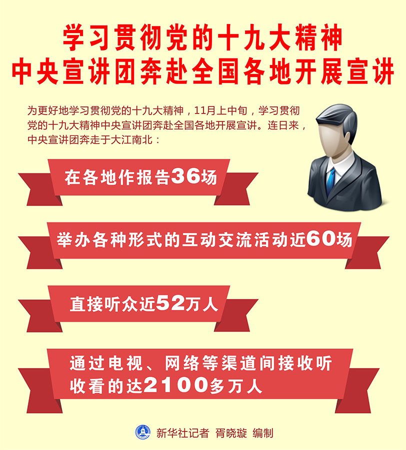 為更好地學(xué)習(xí)貫徹黨的十九大精神,11月上中旬,學(xué)習(xí)貫徹黨的十九大精神中央宣講團(tuán)奔赴全國(guó)各地開(kāi)展宣講。連日來(lái),中央宣講團(tuán)奔走于大江南北,在各地作報(bào)告36場(chǎng),舉辦各種形式的互動(dòng)交流活動(dòng)近60場(chǎng),直接聽(tīng)眾近52萬(wàn)人,通過(guò)電視、網(wǎng)絡(luò)等渠道間接收聽(tīng)收看的達(dá)2100多萬(wàn)人。