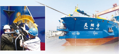 “船上鋼樁臺車安裝了4個大油缸,單個就達(dá)38噸,所有安裝誤差都只有0.2毫米”,安裝輪機(jī)車間主任沙勝紅說,“考驗(yàn)還在繼續(xù)”。輪機(jī)車間的工人全部是訓(xùn)練有素的技術(shù)員工,他們克服了難以想象的困難,硬是拿下全船高難度的設(shè)備安裝工作,質(zhì)量贏得船東、船檢的一致好評。