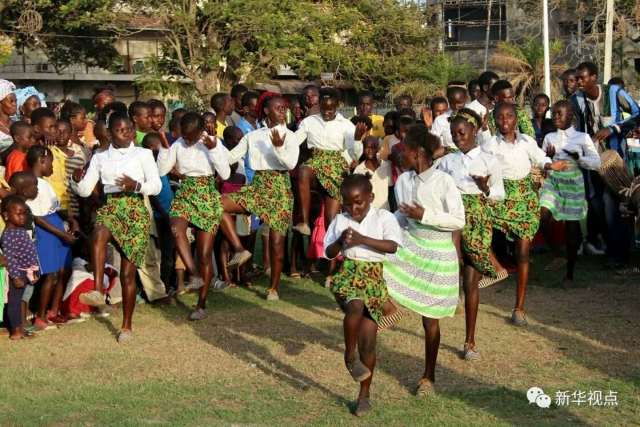 2016年4月30日,岡比亞學(xué)生團體在首都班珠爾建城200周年慶?;顒又斜硌菸璧?。新華社記者 王猛攝