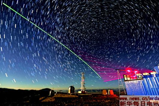 ▲“墨子號”量子科學(xué)實驗衛(wèi)星與阿里量子隱形傳態(tài)實驗平臺建立天地鏈路(合成照片,2016年12月9日攝)。新華社記者金立旺攝
