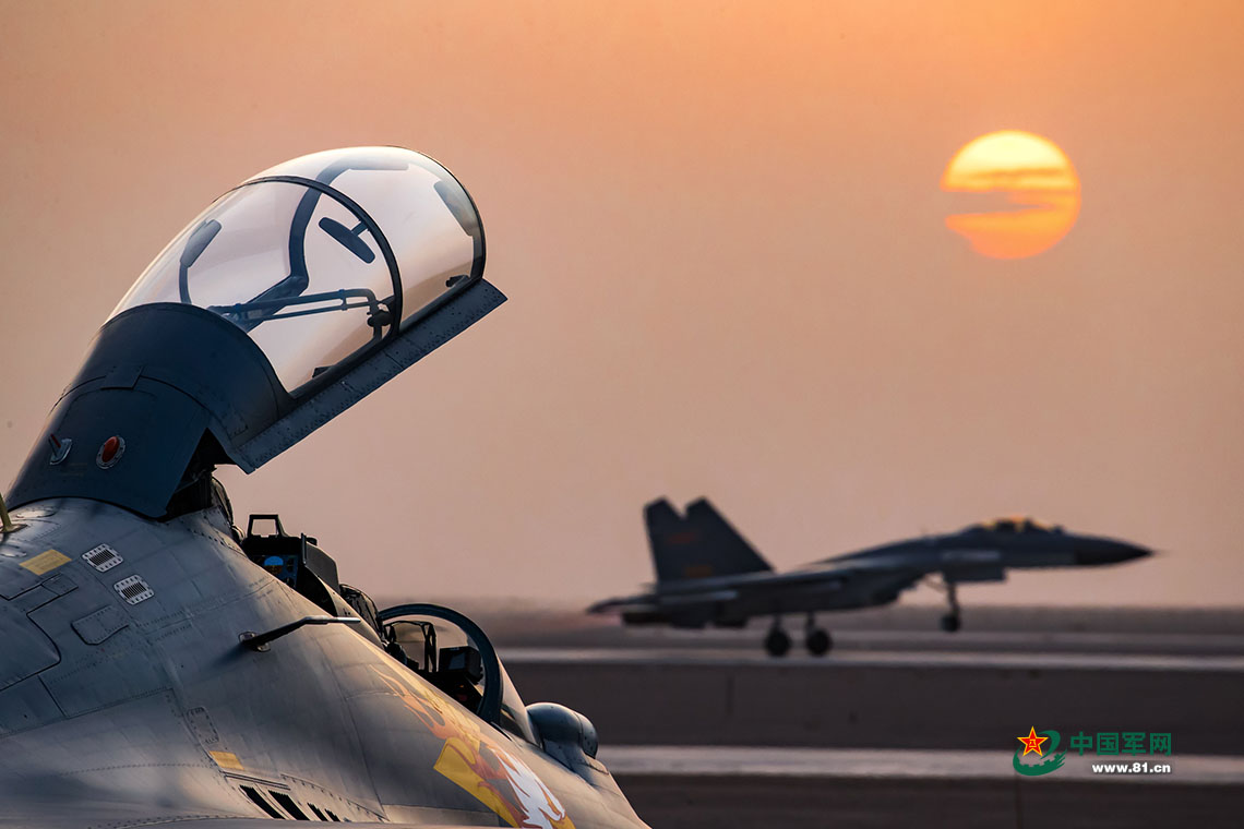 “金頭盔-2017”空軍對抗空戰(zhàn)競賽考核,旭日初升,戰(zhàn)機加力升空。楊盼 攝影