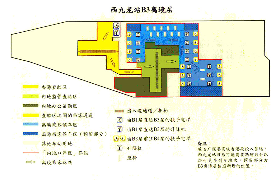 西九龍站口岸分為香港口岸區(qū)和內(nèi)地口岸區(qū)。香港口岸區(qū)由香港特區(qū)依據(jù)特區(qū)法律設(shè)立和管轄,實(shí)行過(guò)境限制區(qū)管理。內(nèi)地口岸區(qū)由內(nèi)地根據(jù)本合作安排和內(nèi)地法律設(shè)立和管轄,實(shí)行口岸管理制度。