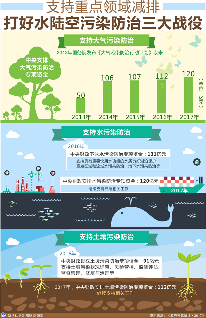 圖表:支持重點(diǎn)領(lǐng)域減排 打好水陸空污染防治三大戰(zhàn)役 新華社記者 周詠緡 編制