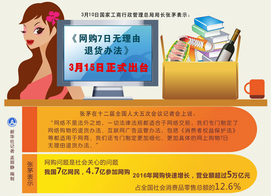圖表:《網(wǎng)購7日無理由退貨辦法》3月15日正式出臺(tái) 新華社記者 孟麗靜 編制
