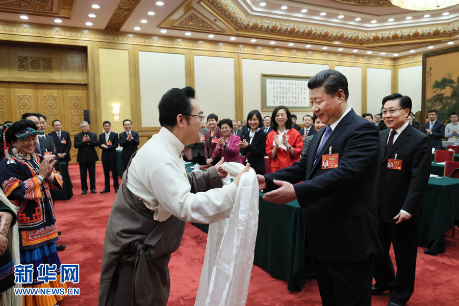2017年3月8日,習近平參加十二屆全國人大五次會議四川代表團的審議。習近平走進會場時,身著民族服裝的藏族、彝族、羌族代表向總書記問好。這是藏族代表獻上潔白的哈達。新華社記者蘭紅光攝
