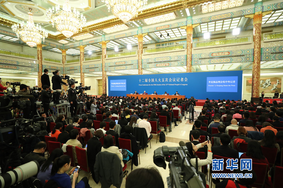 3月15日上午,國務(wù)院總理李克強在人民大會堂三樓金色大廳會見采訪十二屆全國人大五次會議的中外記者并回答記者提出的問題。圖為記者會現(xiàn)場。新華網(wǎng)/中國政府網(wǎng) 翟子赫 攝?