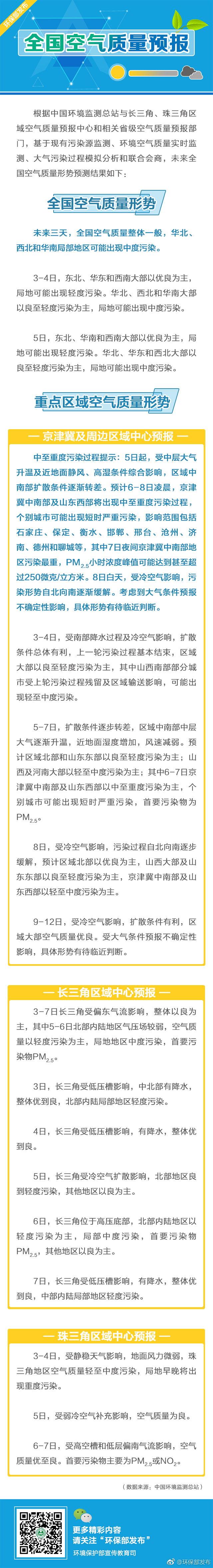 據環(huán)境保護部宣傳教育司官方微博消息,未來三天(1月3日-5日),全國空氣質量整體一般,華北、西北和華南局部地區(qū)可能出現中度污染。5日起,京津冀及周邊區(qū)域中南部擴散條件逐漸轉差。預計6-8日凌晨,京津冀中南部及山東西部將出現中至重度污染過程,個別城市可能出現短時嚴重污染,其中7日夜間中南部地區(qū)污染最重。8日白天,受冷空氣影響,污染形勢自北向南逐漸緩解。