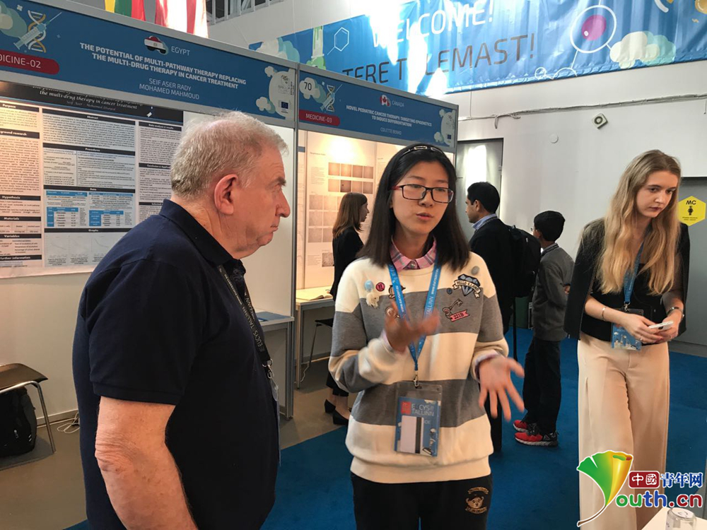 歐盟青少年科學(xué)家競賽中,賀婉卓正在向外國專家做講解。本人供圖