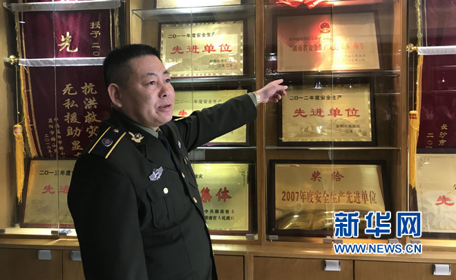 邵陽(yáng)市礦山救護(hù)支隊(duì)隊(duì)長(zhǎng)王建華向記者介紹該隊(duì)獲得的各項(xiàng)榮譽(yù)。新華網(wǎng)于子茹攝