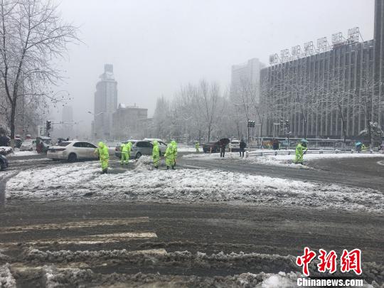 環(huán)衛(wèi)工人在鏟除積雪?!≮w強(qiáng) 攝