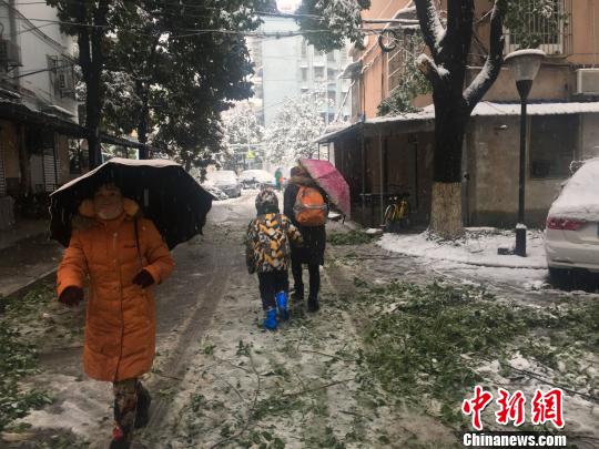 合肥一小區(qū)內(nèi),樹枝被積雪壓斷,砸在路邊??康能囕v上。 趙強(qiáng) 攝