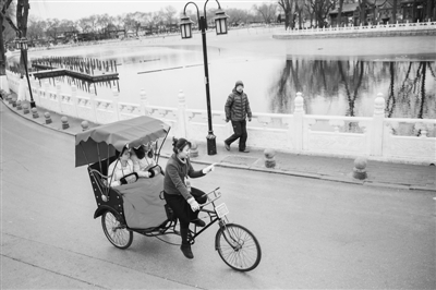 1月4日,北京什剎海景區(qū),車隊為每一個游客都準備了毯子御寒。圖為王雪宜為兩名年輕游客鋪完毯子后交流今天的行程路線。