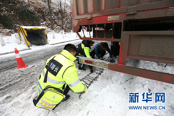 湖北五峰土家族自治縣仁和坪鎮(zhèn)“路長”高恩強(左一)在楊柳池村到金家垴路段指導過往貨車安裝防滑鏈(1月5日攝)。新華社記者 王自宸 攝
