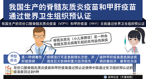 圖表:我國(guó)生產(chǎn)的脊髓灰質(zhì)炎疫苗和甲肝疫苗通過世界衛(wèi)生組織預(yù)認(rèn)證 新華社發(fā) 大巢制圖