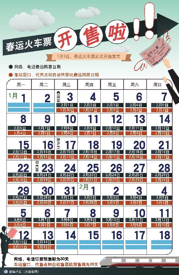 根據(jù)往年春運(yùn)出行特點(diǎn),初五至初八是返程高峰期。網(wǎng)絡(luò)、電話訂票預(yù)售期為30天,因此22日至25日將迎返程票搶票高峰。