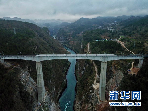 1月25日,渝貴鐵路從貴陽北到重慶西的D8592次首發(fā)動車經(jīng)過遵義市境內(nèi)的烏江大橋。 當(dāng)日,設(shè)計時速200公里的渝貴鐵路全線開通運營。新華社記者 劉續(xù)攝