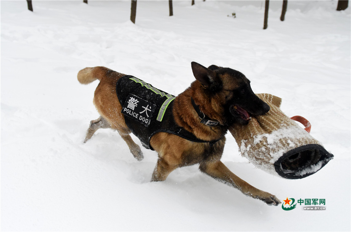1月27日,武警安徽總隊機動支隊警犬班班長王營廣帶領警犬“魯克”進行搜尋訓練。
