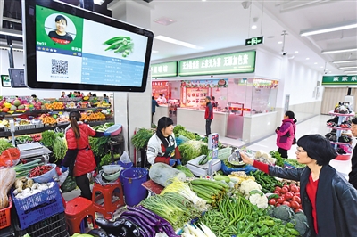 安徽省合肥市瑤海區(qū)勝利智能農(nóng)貿(mào)市場,每個攤位都安裝了電子屏,只需掃碼即可實現(xiàn)移動支付,還可在平臺對商家進行點評、維權(quán)投訴等。掃碼“滴”聲之后,現(xiàn)實與虛擬被連接,這種黑白方格組成的“時代符號”(二維碼)帶來了便利、快捷和驚喜?!埓髰彅z(新華社發(fā))