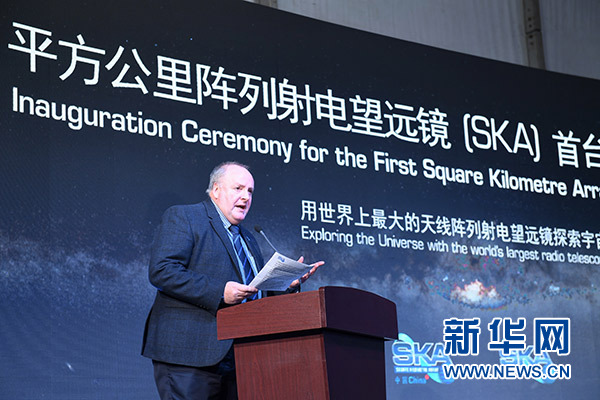 2月6日,SKA總干事菲利普·戴蒙德在SKA——平方公里陣列射電望遠鏡首臺天線樣機啟動儀式上致辭。新華社記者 牟宇 攝