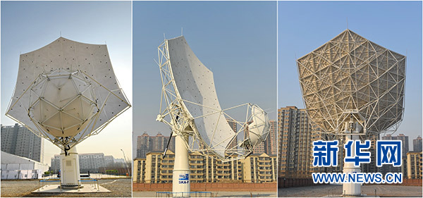 這是SKA——平方公里陣列射電望遠鏡首臺天線樣機的正面(左)、側面(中)和背面(2月6日攝,拼版照片)。新華社記者 牟宇 攝