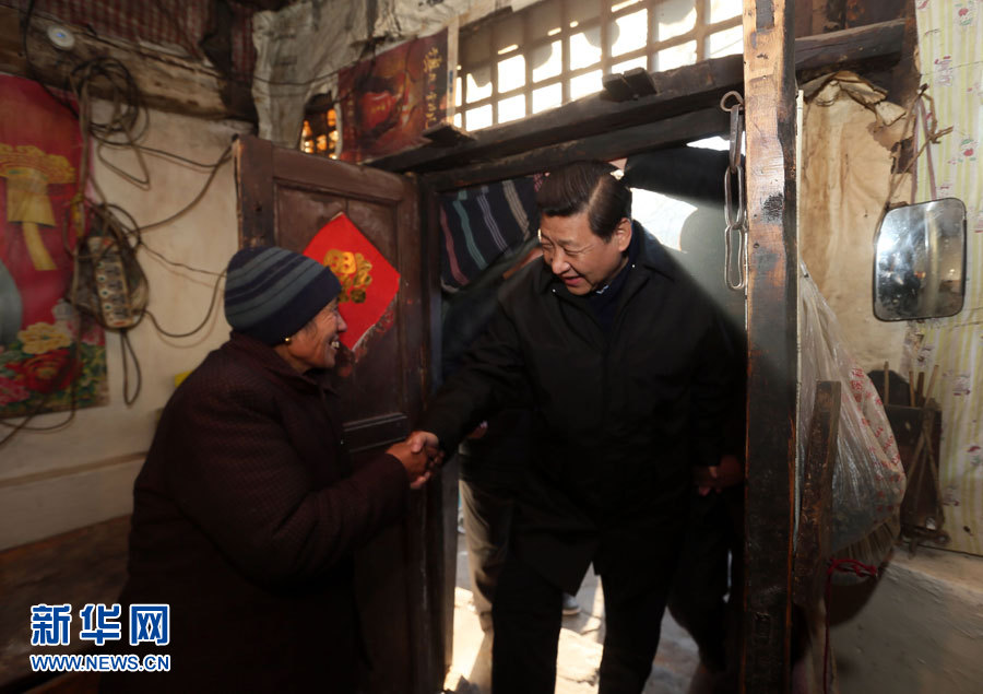在河北阜平龍泉關(guān)鎮(zhèn)駱駝灣村困難戶唐榮斌家,習(xí)近平拿起桌上的藥瓶仔細(xì)查看,囑咐老人多多保重身體。