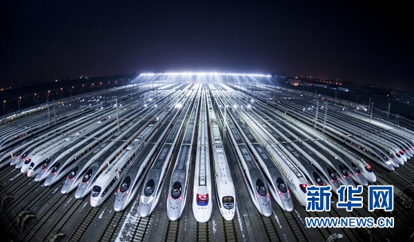 2018年2月1日凌晨,動車組??吭谖錆h動車段的存車線上,準備進行檢修和保溫作業(yè)。新華社記者 肖藝九 攝