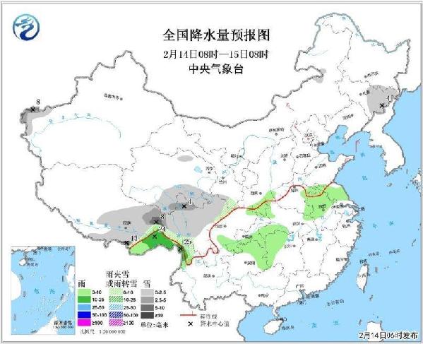 全國降水量預(yù)報(bào)圖(2月14日08時-15日08時)