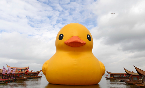 在云南省昆明市滇池邊上的古滇名城碼頭,“大黃鴨”停在畫(huà)舫旁(1月13日攝)。新華社記者 藺以光 攝