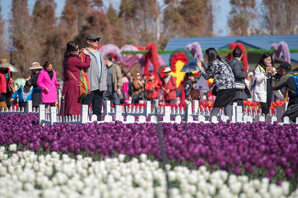 游客在云南省昆明市撈魚(yú)河濕地公園郁金香花海中拍照(2月17日攝)。新華社記者 胡超 攝