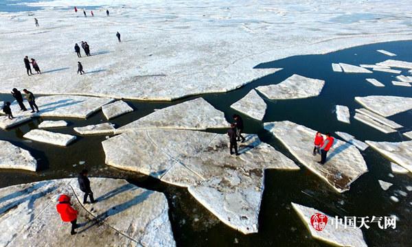 遼寧大連氣溫連續(xù)回升,海冰融化,游人冒險(xiǎn)踏冰。(圖/呂文正)