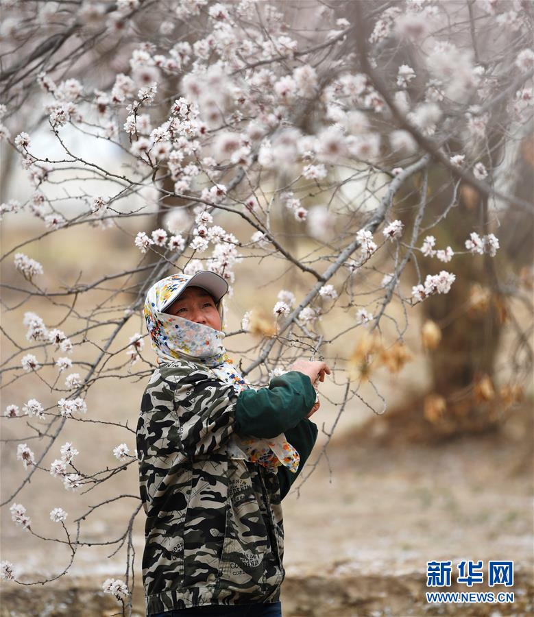3月28日,農(nóng)民在敦煌鳴沙山下的李廣杏園內勞作。近日,甘肅省敦煌市鳴沙山下8000多畝李廣杏花競相開放,吸引了眾多游客和市民踏青賞花。 新華社記者陳斌攝