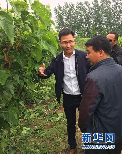 江蘇宿遷市宿城區(qū)埠子鎮(zhèn)蠶桑村黨支部書(shū)記周炳均(左)帶著村組干部、黨員和種植大戶(hù)30余人在徐州參觀果桑種植等項(xiàng)目(2017年5月4日攝)。新華社發(fā)