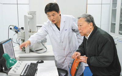 陳清如院士(右)在指導(dǎo)實(shí)驗(yàn)。資料圖片