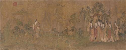 《洛神賦圖》取材于曹植的《洛神賦》,是東晉顧愷之的畫作。它將“曹植與洛水之神相會、相知、相愛,卻因人神之戀無望而依依惜別”的凄美愛情故事表達得淋漓盡致。這幅畫的原作遺失,現(xiàn)存于世的是宋代的四件摹本,分別藏于北京故宮博物院、遼寧省博物館和美國弗利爾美術(shù)館。
