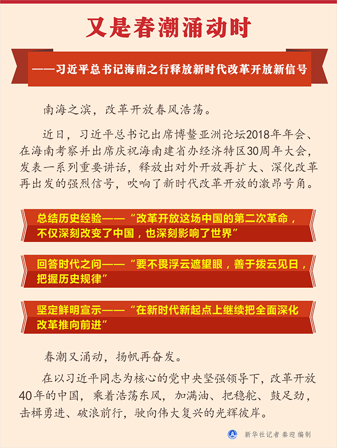 新華社北京4月13日電 題:又是春潮涌動時——習近平總書記海南之行釋放新時代改革開放新信號