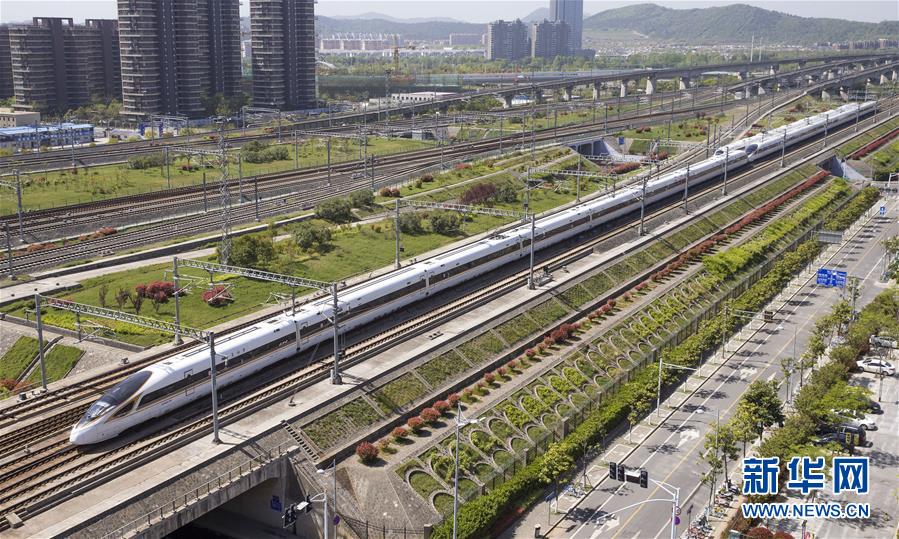 4月9日,一列“復興號”動車組列車行駛在京滬高鐵南京市境內(nèi)。國家統(tǒng)計局4月17日發(fā)布數(shù)據(jù),初步核算,一季度國內(nèi)生產(chǎn)總值198783億元,按可比價格計算,同比增長6.8%。 新華社發(fā)(蘇陽 攝)