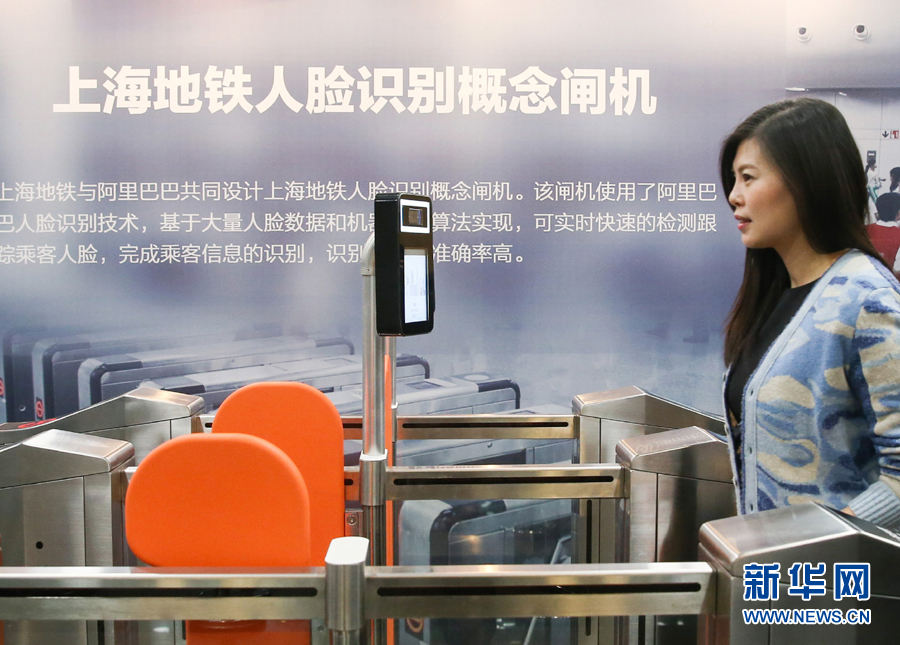 在上海申通地鐵集團有限公司,工作人員在現(xiàn)場體驗刷臉進站技術(2017年12月5日攝)。新華社記者 丁汀 攝