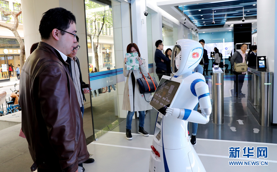一位市民在位于上海九江路的無人銀行入口處向迎賓機器人說明需要辦理的業(yè)務種類(4月12日攝)。近日,中國建設銀行在上海九江路開出國內(nèi)首家無人銀行。新華社記者 方喆 攝